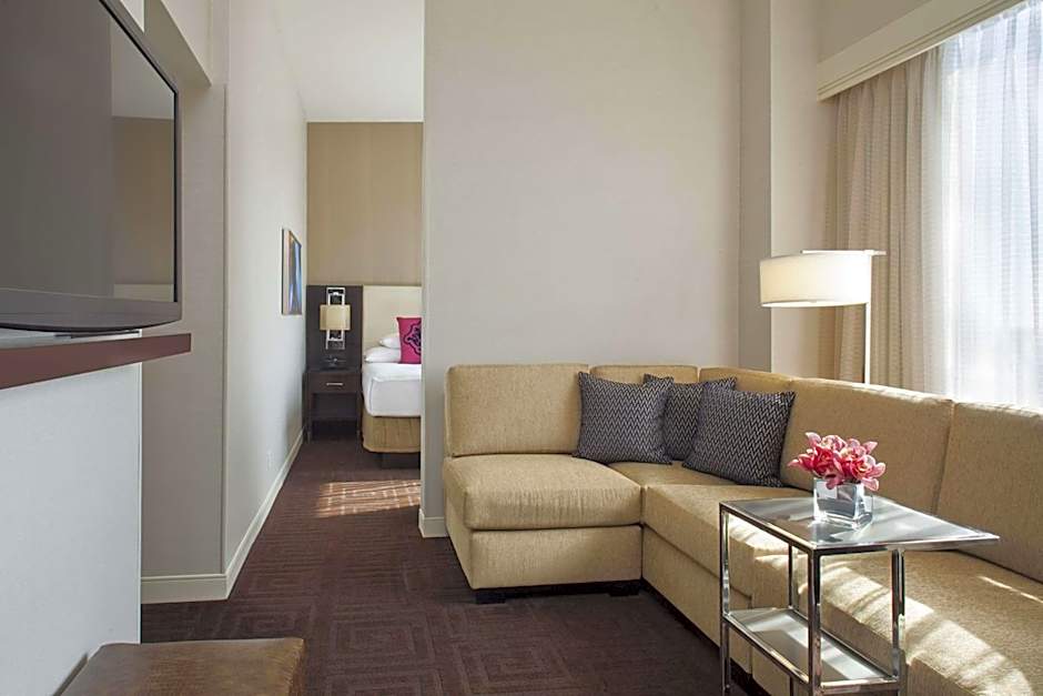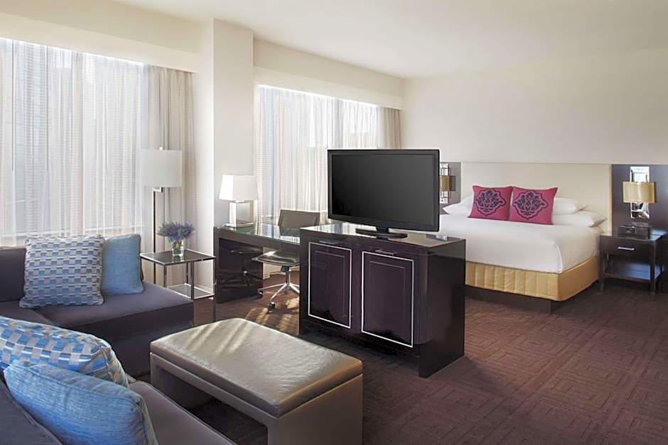 Featuring a separate seating area with sofa, this room offers a flat-screen cable TV, compact refrigerator and work desk. Guests can enjoy views of the city.